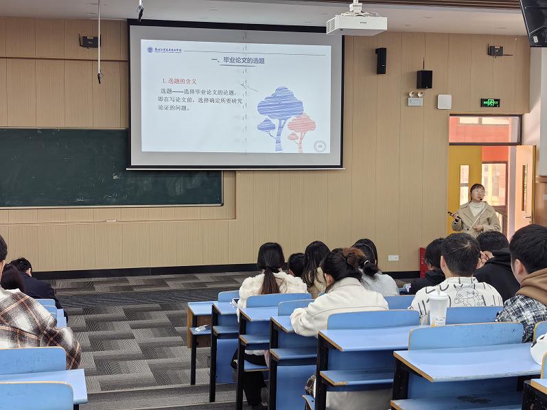 首先,教研室负责论文工作的步倩老师以“如何撰写本科毕业论文”为题,围绕论文选题注意事项、论文写作步骤、论文构成及写作要求等内容为同学们进行了认真讲解,并要求同学们会后继续跟指导教师沟通论文撰写具体事项,确保能够高质量完成毕业论文撰写工作。