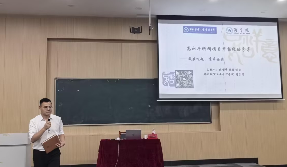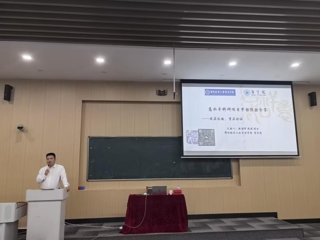 2025年9月16日下午,我院邀请到郑州航空工业管理学院商学院副院长周雪峰教授为全体教师开展了《高水平科研项目申报经验分享——成在选题,重在论证》的学术讲座。商学院院长全淅玉、教学科研副院长朱永生及全体教师参加了本次讲座。