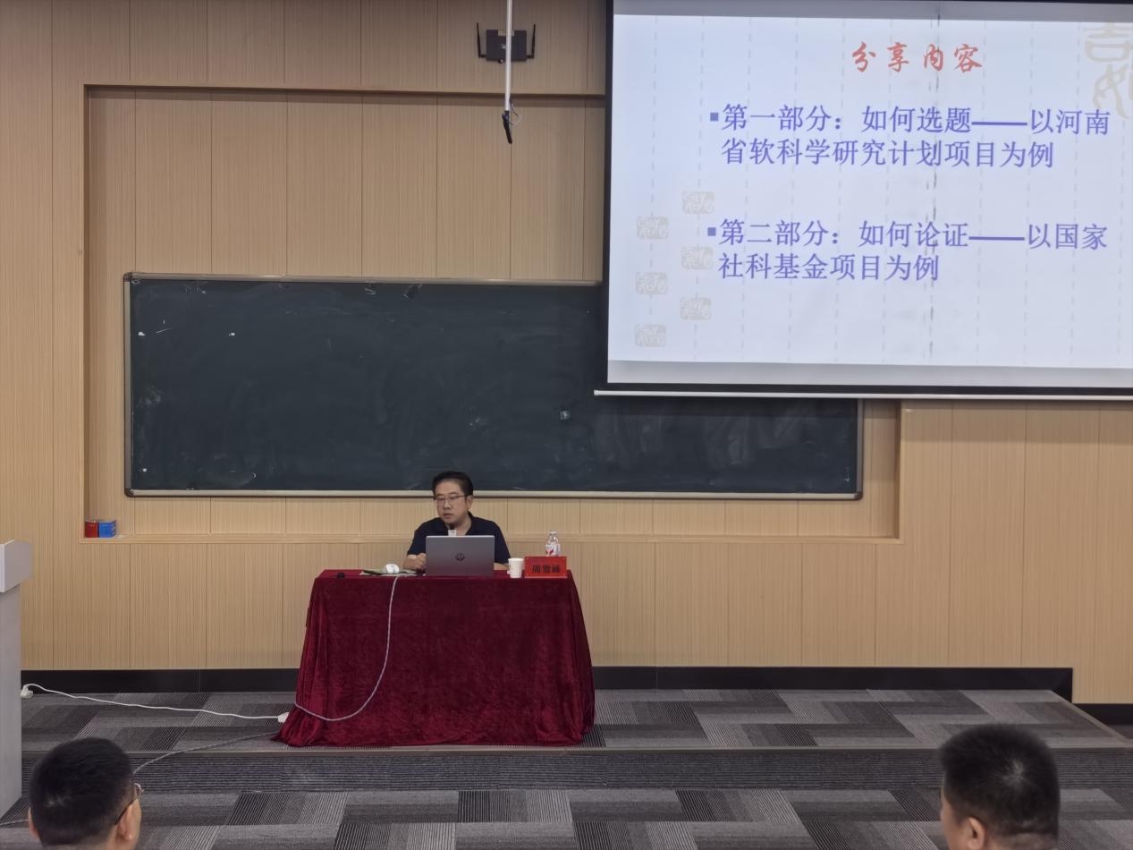 接下来,周雪峰教授以《高水平科研项目申报经验分享——成在选题,重在论证》为题,结合自身深耕科研项目多年的丰富经验,为在场教师带来了一场兼具理论高度与实践温度的精彩分享。周教授充分考虑到不同级别课题的申报特点与教师们的实际需求,以河南省软科学的申报为切入点,深入到国家社会科学基金项目的申报,整个分享过程中,不仅清晰梳理了选题的核心原则、研究内容撰写的逻辑框架与实操要点,更通过案例对比让抽象的方法变得具体可感。通过逐点剖析案例中的亮点与问题,他将申报技巧融入实际场景,为不同需求的教师提供了兼具针对性与实用性的申报指引,有效破解了教师们在课题申报中的困惑,为教师们提供了兼具针对性与实用性的申报指引。