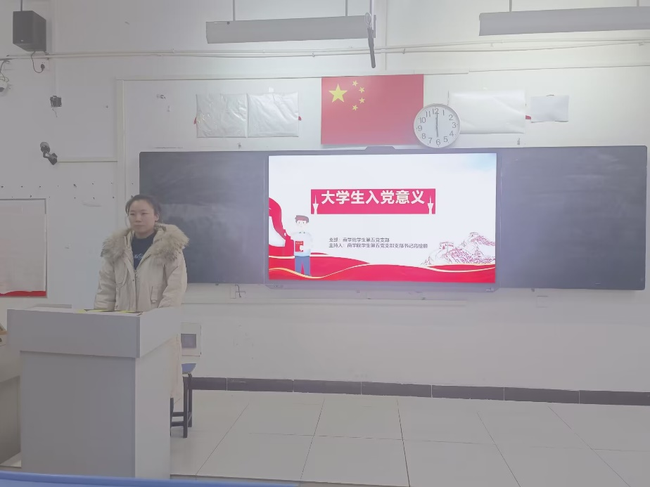 12月20日,商学院学生第五党支部在文华三-105教室开展了“大学生入党意义”主题党课,本次党课由支部书记高绘丽同志主讲,商学院学生第五党支部全体成员参加。