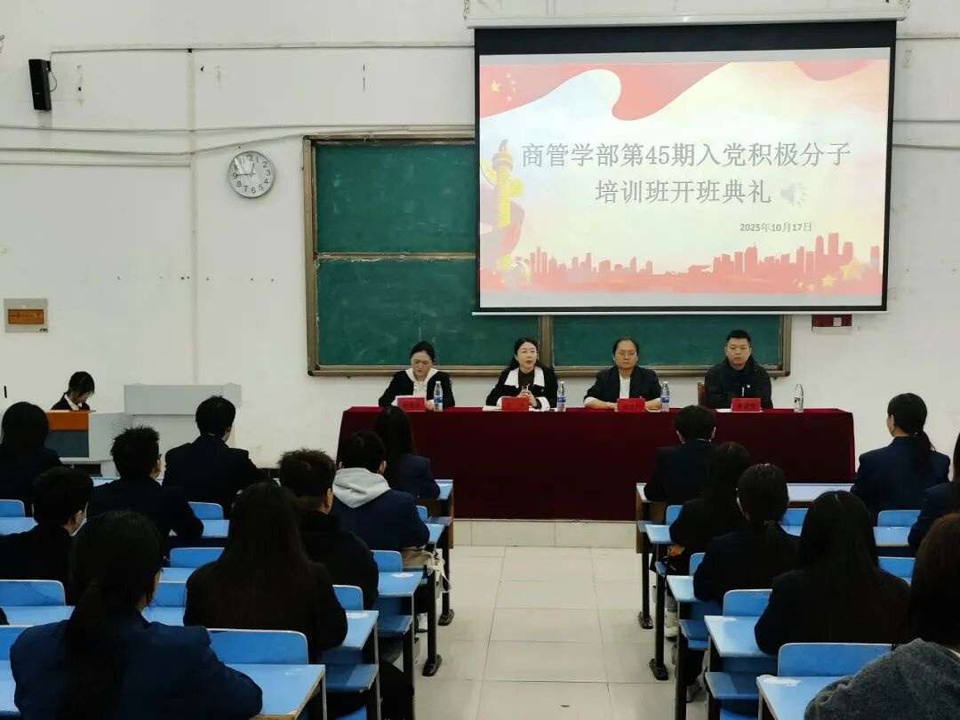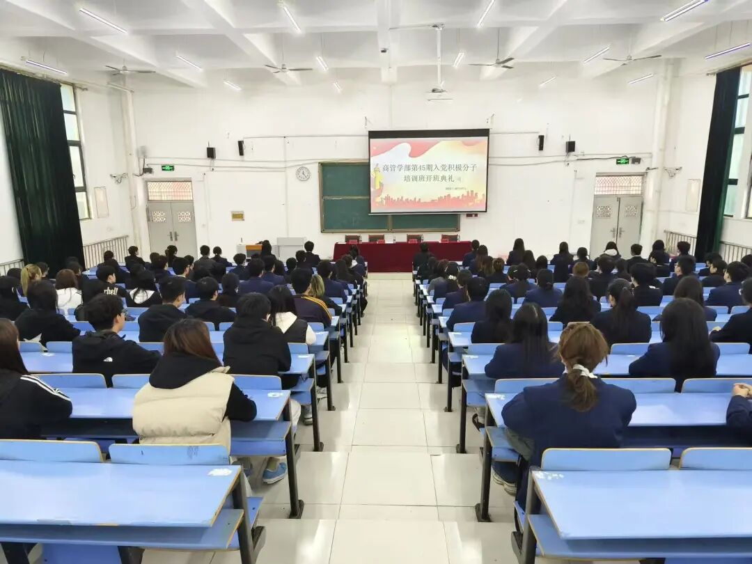 为切实加强对入党积极分子的培养教育,提高其思想政治素质和理论水平,夯实党员发展工作基础。2025年10月17日,商学院于文华阶梯六开展第45期入党积极分子培训班开班典礼。商学院党委书记、学生管理副院长李婷,管理学院团委书记张梦垚,管理学院组织员杨爽爽,商学院组织员李亚辉以及全体45期入党积极分子出席此次典礼。