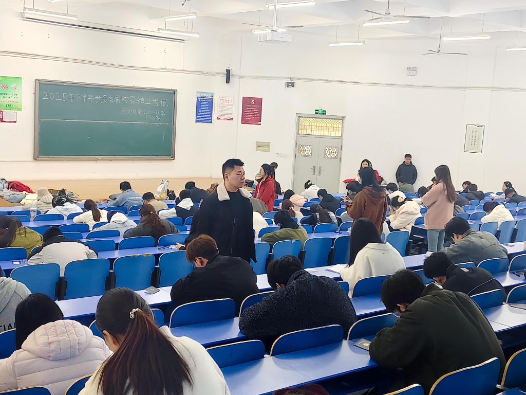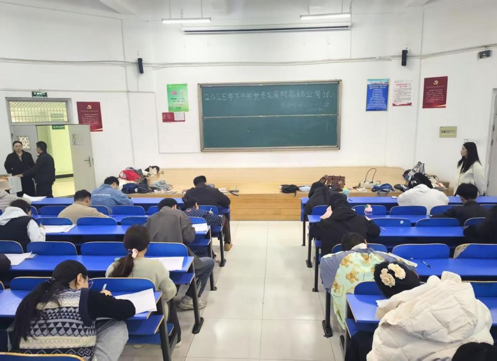 本次考试以闭卷形式进行,命题聚焦党的创新理论、党章党规最新要求、党史学习教育重点、新时代党风廉政建设等核心维度,既考“知识掌握度”,也测“思想领悟力”,全方位检验学员的政治素养与理论储备。考前,监考老师李亚辉逐项明确考试纪律,强调“严肃考风、规范作答”的要求,从细节处压实考务责任;考试过程中,学员们专注审题、认真作答,监考人员全程细致巡查,考场氛围既庄重有序,又尽显发展对象队伍的严谨学风。