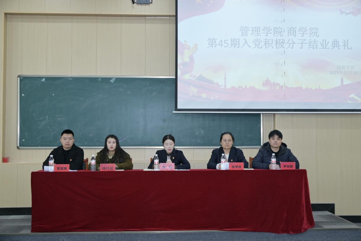 为切实做好党员发展工作,提升入党积极分子的思想理论水平和党性修养,11月18日,商学院第45期入党积极分子培训班结业典礼在东校区文华楼阶五如期举行。商学院党委书记、学管副院长李婷,管理学院分团委书记张梦垚,商学院分团委副书记杨钧茹,商学院组织员李亚辉,管理学院组织员尹向前及本期全体积极分子学员参会,本次会议由李亚辉老师主持。
