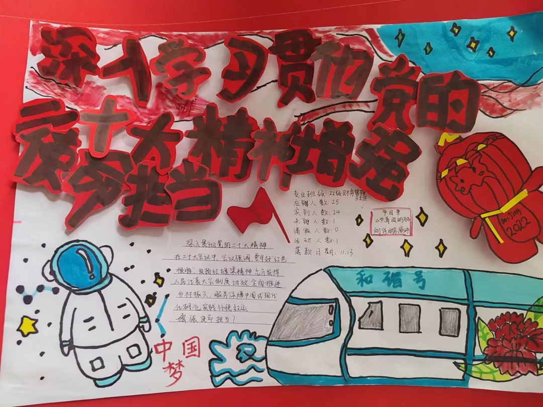 党的二十大在全党全国各族人民迈上全面建设社会主义现代化国家新征程、向第二个百年奋斗目标进军的关键时刻召开的一次十分重要的大会,是一次高举旗帜、凝聚力量、团结奋进的大会,在新时代新征程夺取中国特色社会主义新的伟大胜利,具有极其重大而深远的意义。要深刻认识到新形势下学习贯彻党的二十大精神是当前和今后一个时期全党全国各族人民政治生活中的一项重要任务。郑州工业技术学院商学院于2022年11月13日组织22级各团支部开展“深入学习贯彻党的二十大精神,增强使命担当”的主题团日活动。