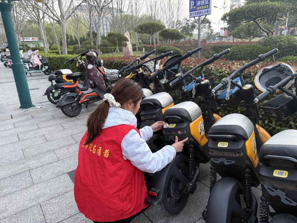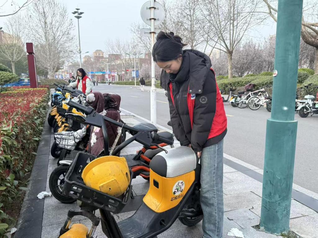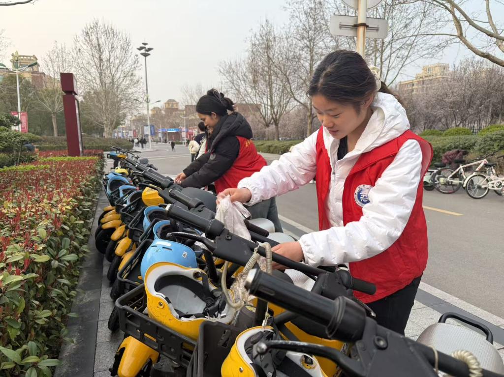 活动现场,志愿者们分工协作、有条不紊,对校园周边、主干道、交通路口及人员密集区域的共享单车进行集中整治。大家主动俯身扶正倒地车辆,将乱停乱放、占道拥堵的单车统一搬运至指定停放区域,严格按照车头同向、排列整齐、不占盲道、不阻通行的标准规范摆放,让原本杂乱拥挤的停车区域焕然一新。与此同时,细致清理车筐、车身、座椅及二维码区域的违规小广告、残留贴纸与顽固污渍,耐心铲除影响市容的“牛皮癣”,切实还原共享单车干净整洁、清爽美观的使用状态,用细致劳动守护公共设施。