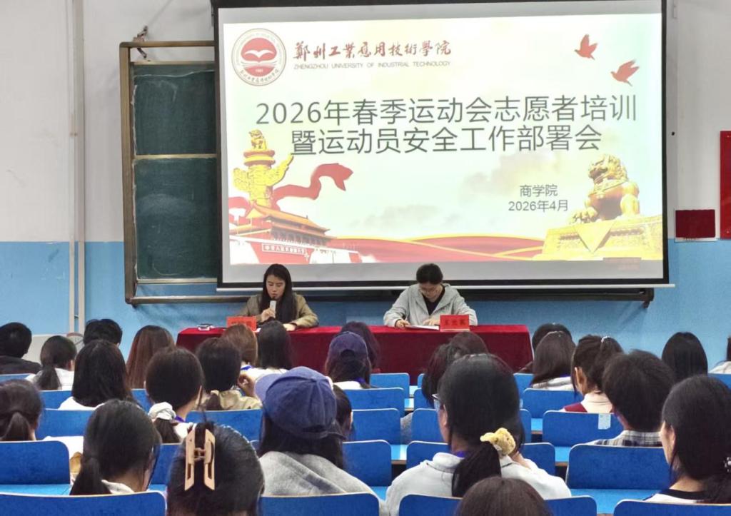 为保障学院运动会安全、有序、高效举办,全面提升志愿者服务水平,守好运动员安全防线,2026年4月21日,商学院在科技楼KX1—1召开运动会志愿者培训暨运动员安全工作部署会。商学院分团委书记杨钧茹、辅导员王光英出席会议,全体学生会志愿者及运动员代表参会。