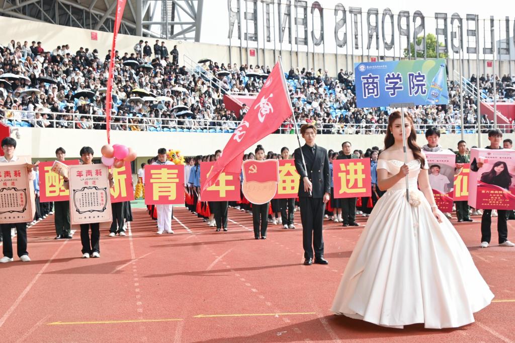 在国旗护卫队、彩旗队之后,商学院百人方阵第九个登场。学子们步伐整齐、身姿挺拔、目光坚定,口号响彻赛场:精商明道,立于我身;盛世中国,气势磅礴;七七荣光,再创辉煌;党徽领航,共谱华章。