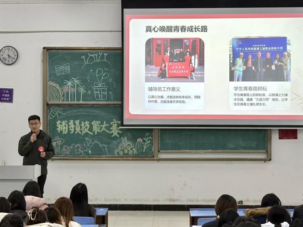 为提升辅导员队伍专业素养、加强我校思想政治工作,2025年12月10日,商管学部在文华楼阶2举办了辅导员素质能力大赛,本次比赛由商管学部党委书记、学管副部长李婷,管理学院分团委书记张梦垚,商学院分团委副书记杨钧茹,辅导员代表王光英老师、雍晓宇老师、王倩文老师担任评委。商管学部全体辅导员和学生代表们参加。
